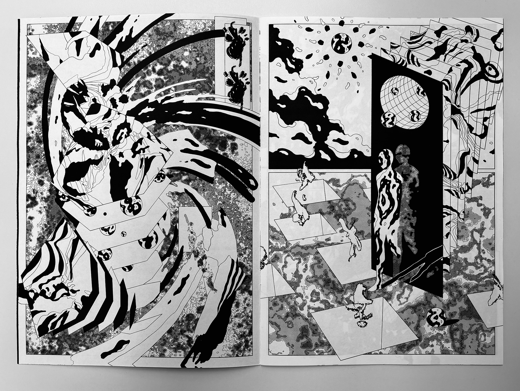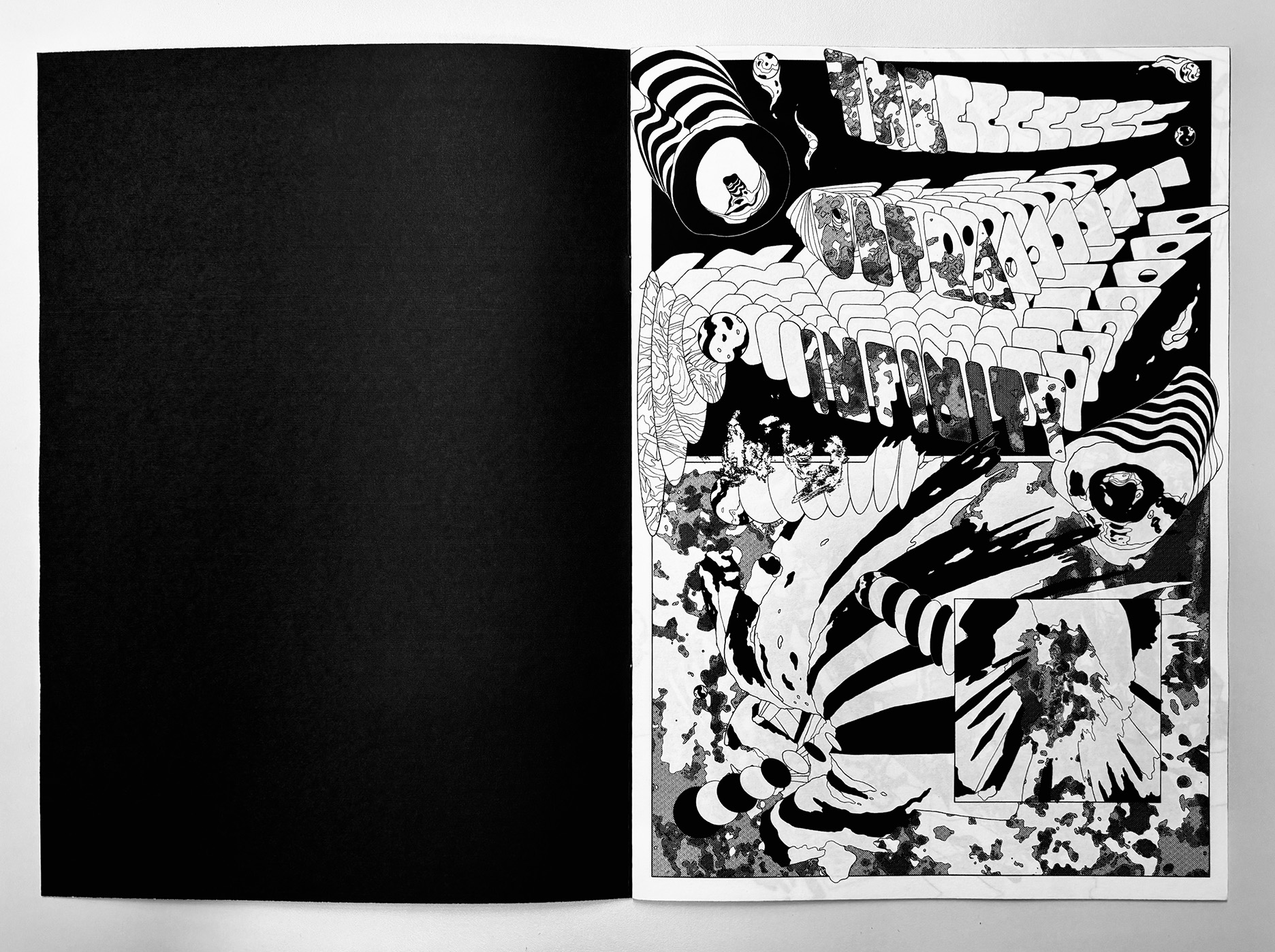 Ultra Infinity is a fast, high-density abstract comic that compresses scale, motion, and speculation into a continuous visual surge. Using bold contrasts and destabilized compositions, the book moves between microscopic and cosmic impressions without anchoring them to narrative or characters. Pages function as bursts rather than sequences, creating a sense of acceleration and expansion that pushes the reading experience toward pure sensation and intensity.