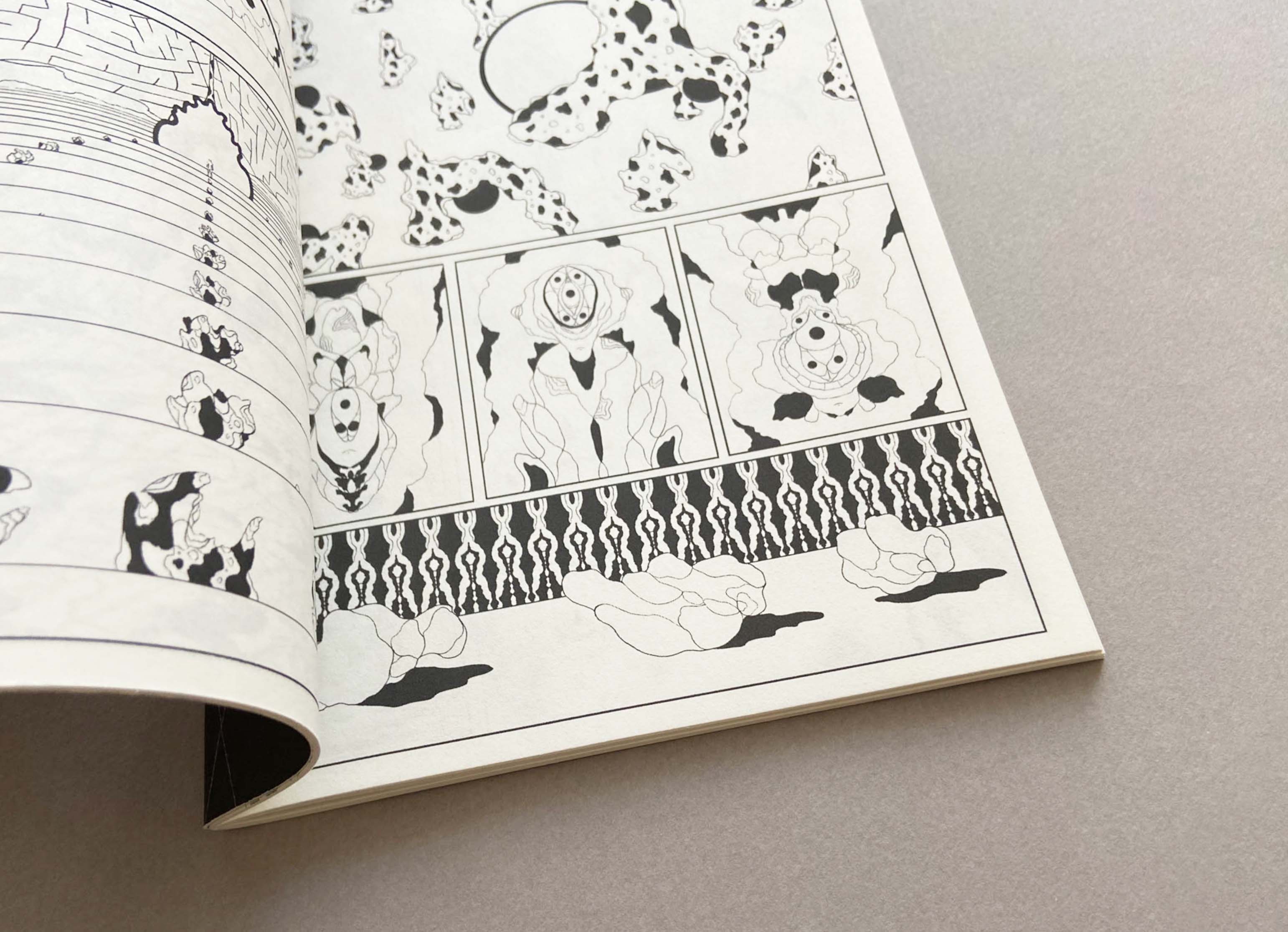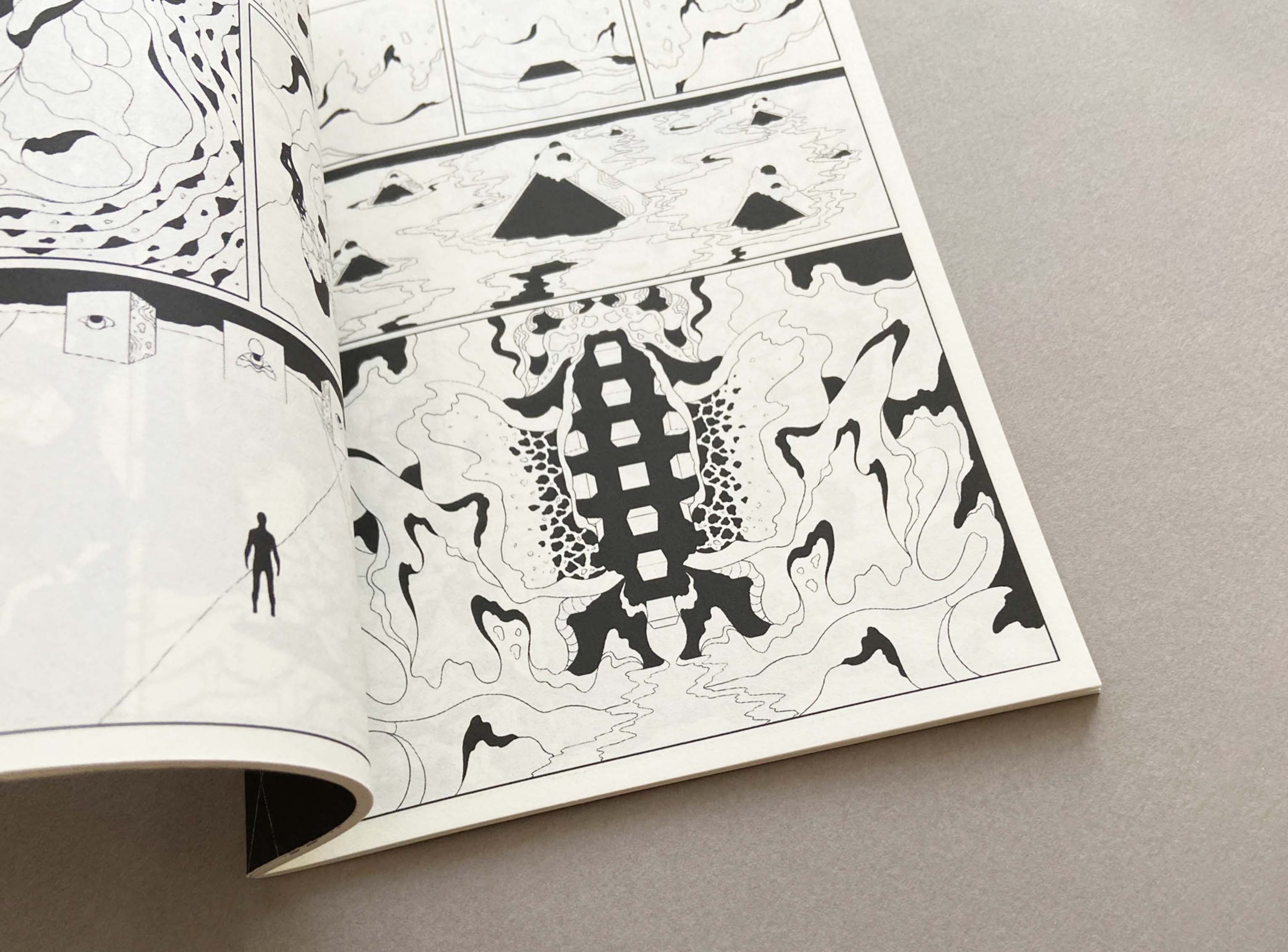 At the Night Gate 2 deepens the visual language of the series through denser compositions and heightened spatial tension. Repetition and variation create a sense of movement without direction, suggesting traversal through unstable environments. The pages emphasize transition, drifting further away from readable structure.