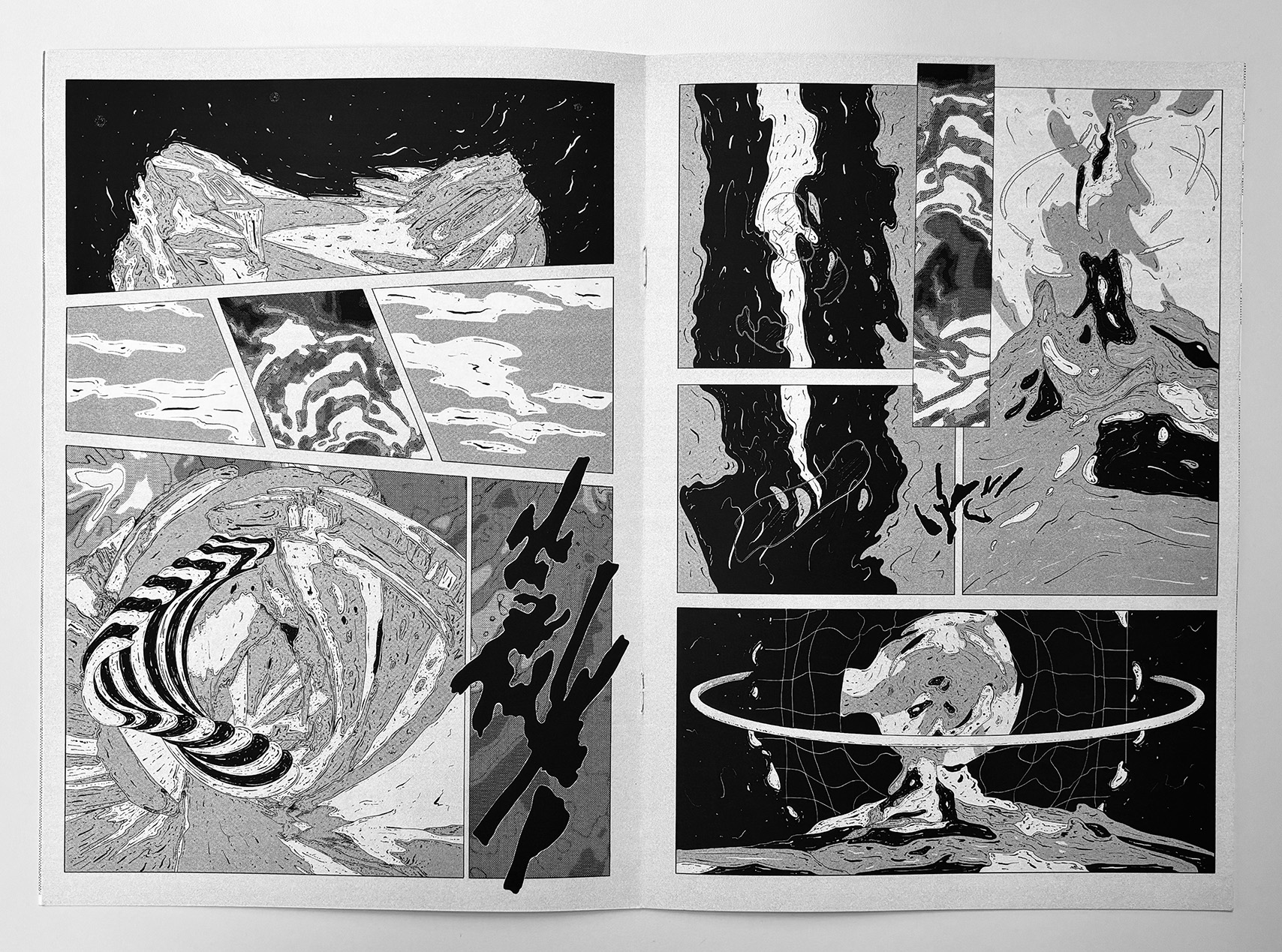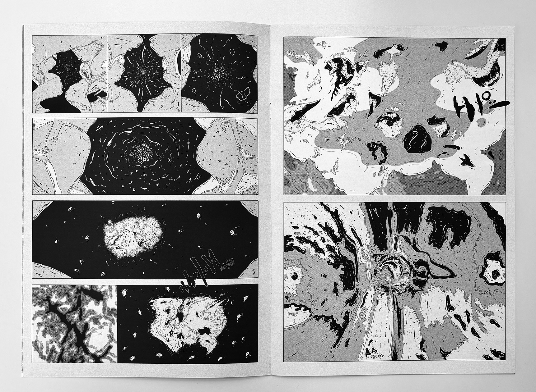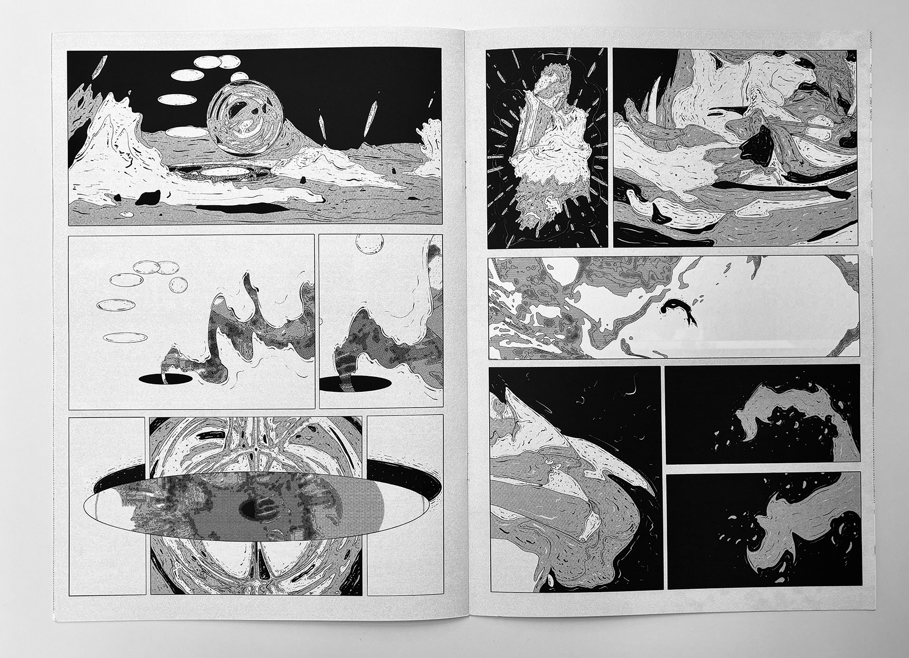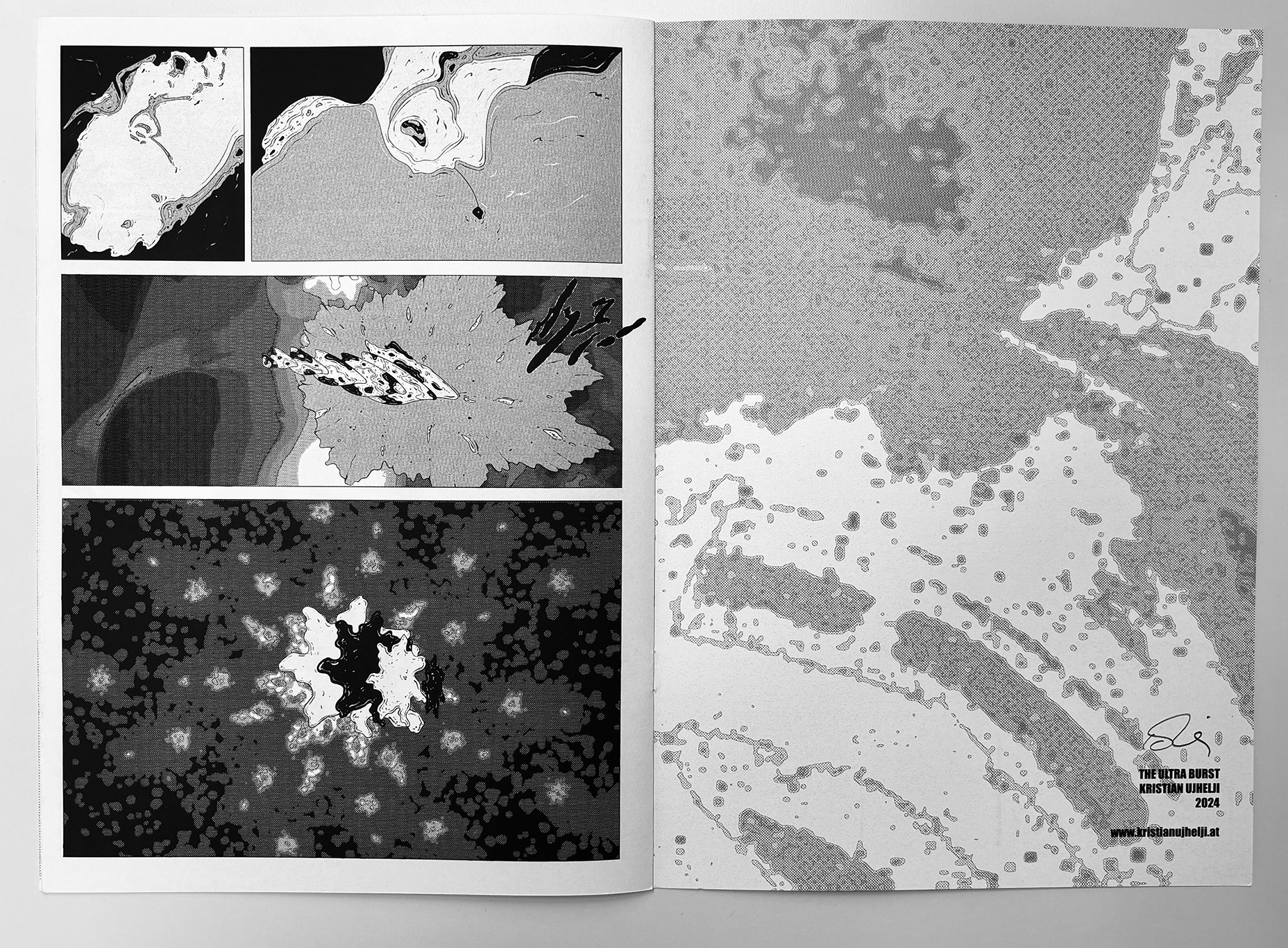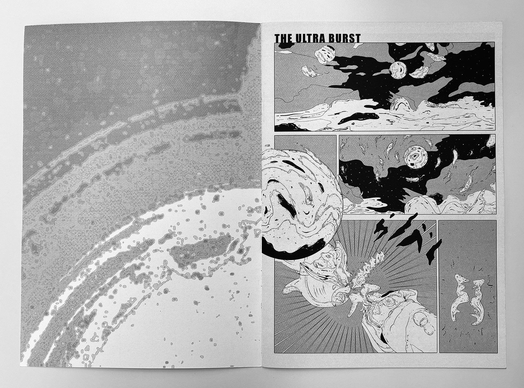 The Ultra Burst is an 8-page experimental comic that plays with the surface language of traditional comics while removing narrative explanation. Familiar panel structures contain abstract, science-fiction–inflected imagery that resists interpretation, creating a rapid, disorienting reading experience. The work functions as a visual burst—compact, intense, and open-ended—inviting readers to engage through intuition rather than story.