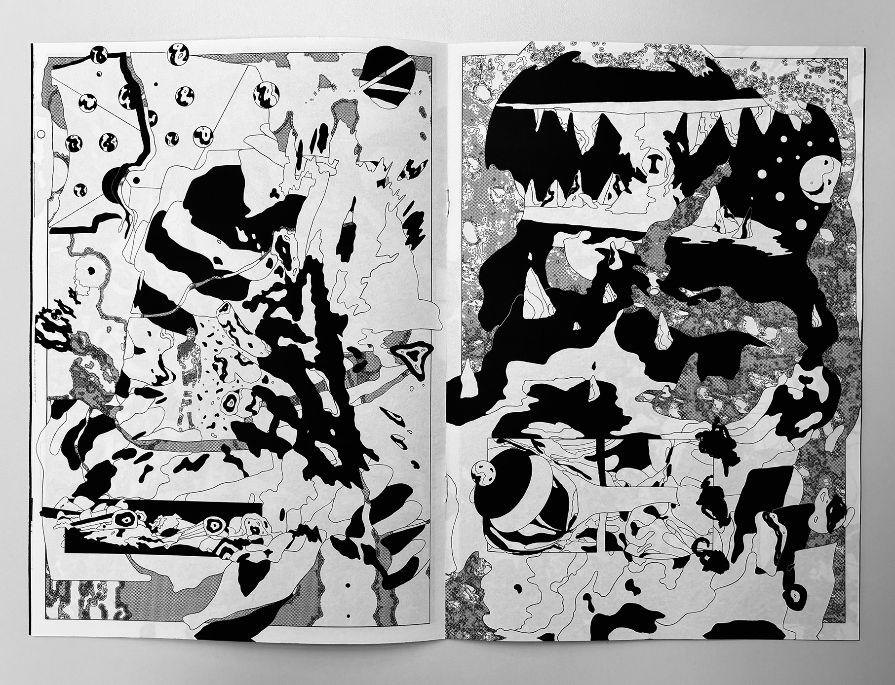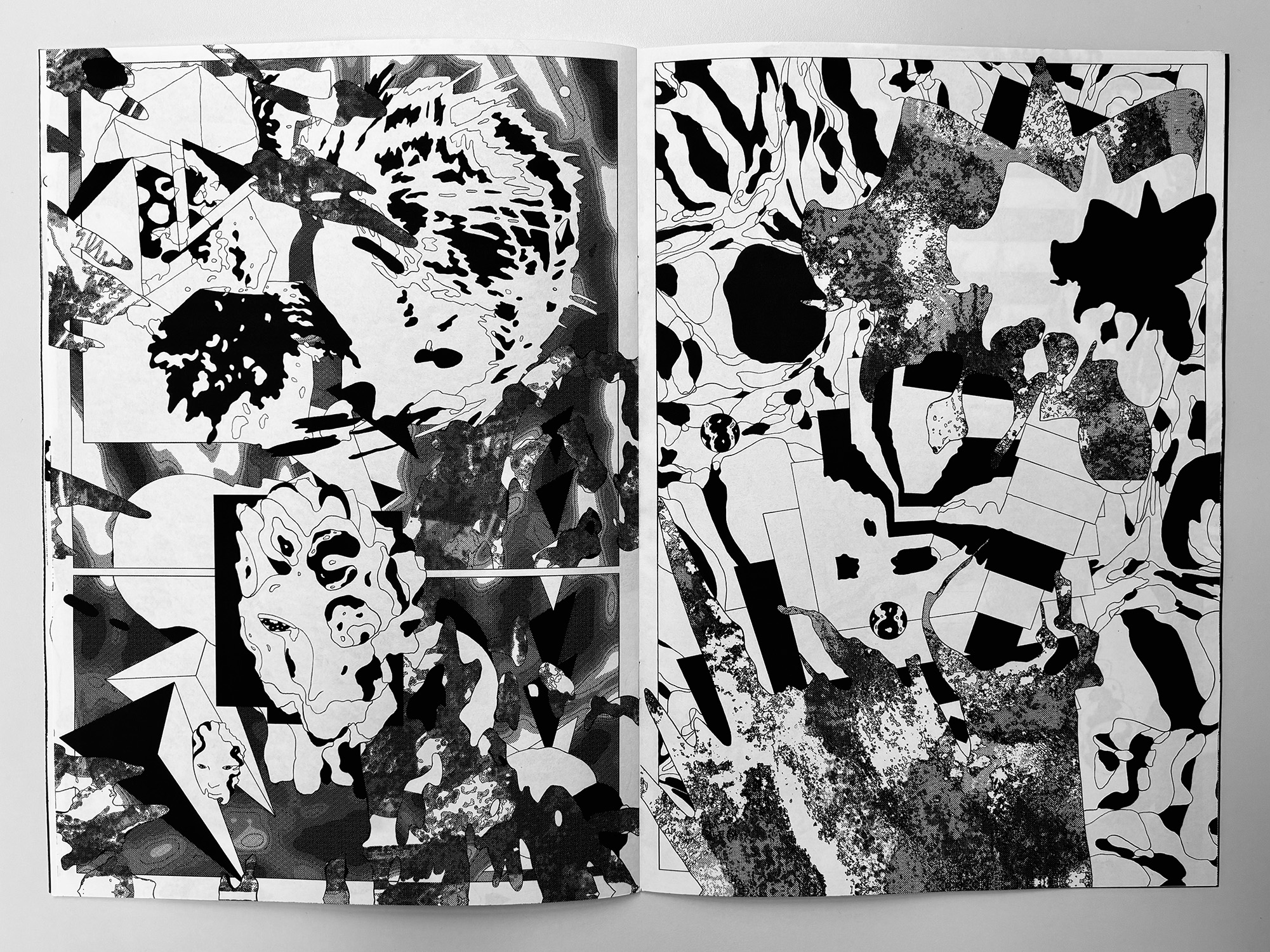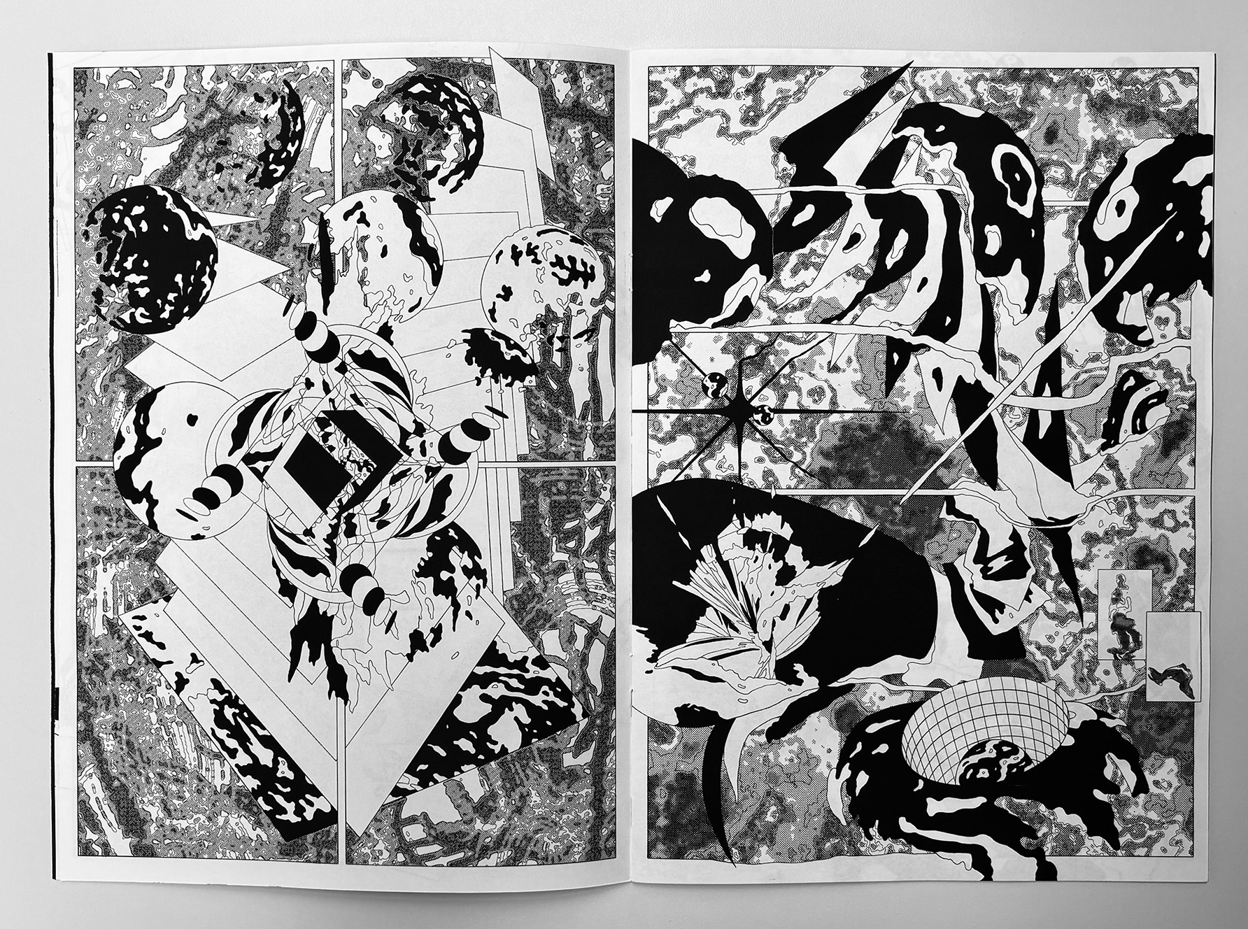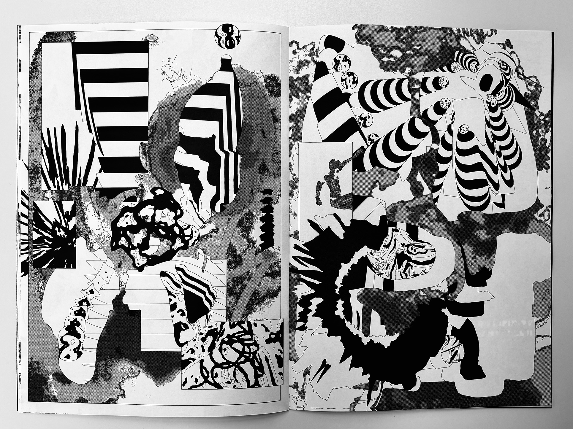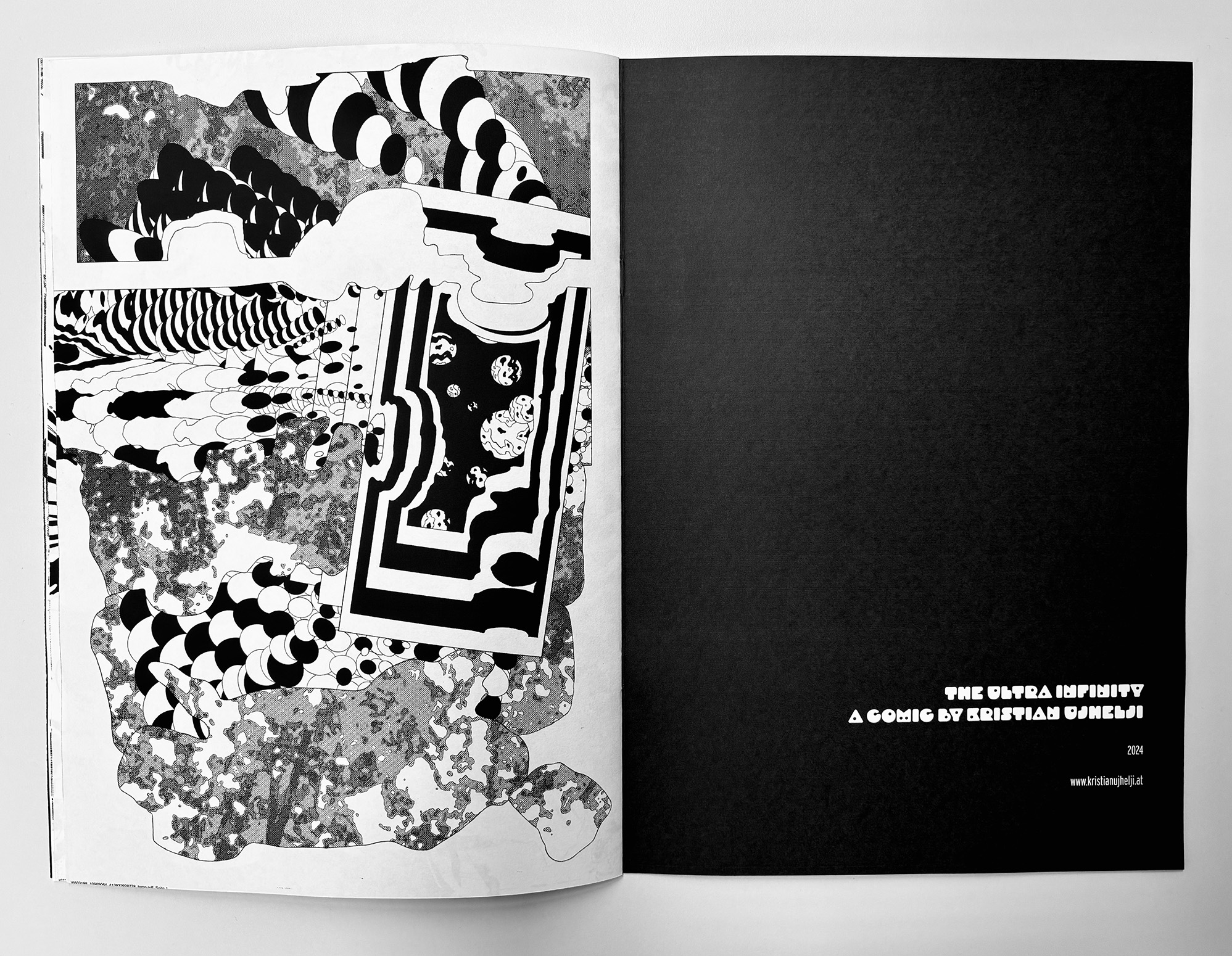 Ultra Infinity is a fast, high-density abstract comic that compresses scale, motion, and speculation into a continuous visual surge. Using bold contrasts and destabilized compositions, the book moves between microscopic and cosmic impressions without anchoring them to narrative or characters. Pages function as bursts rather than sequences, creating a sense of acceleration and expansion that pushes the reading experience toward pure sensation and intensity.